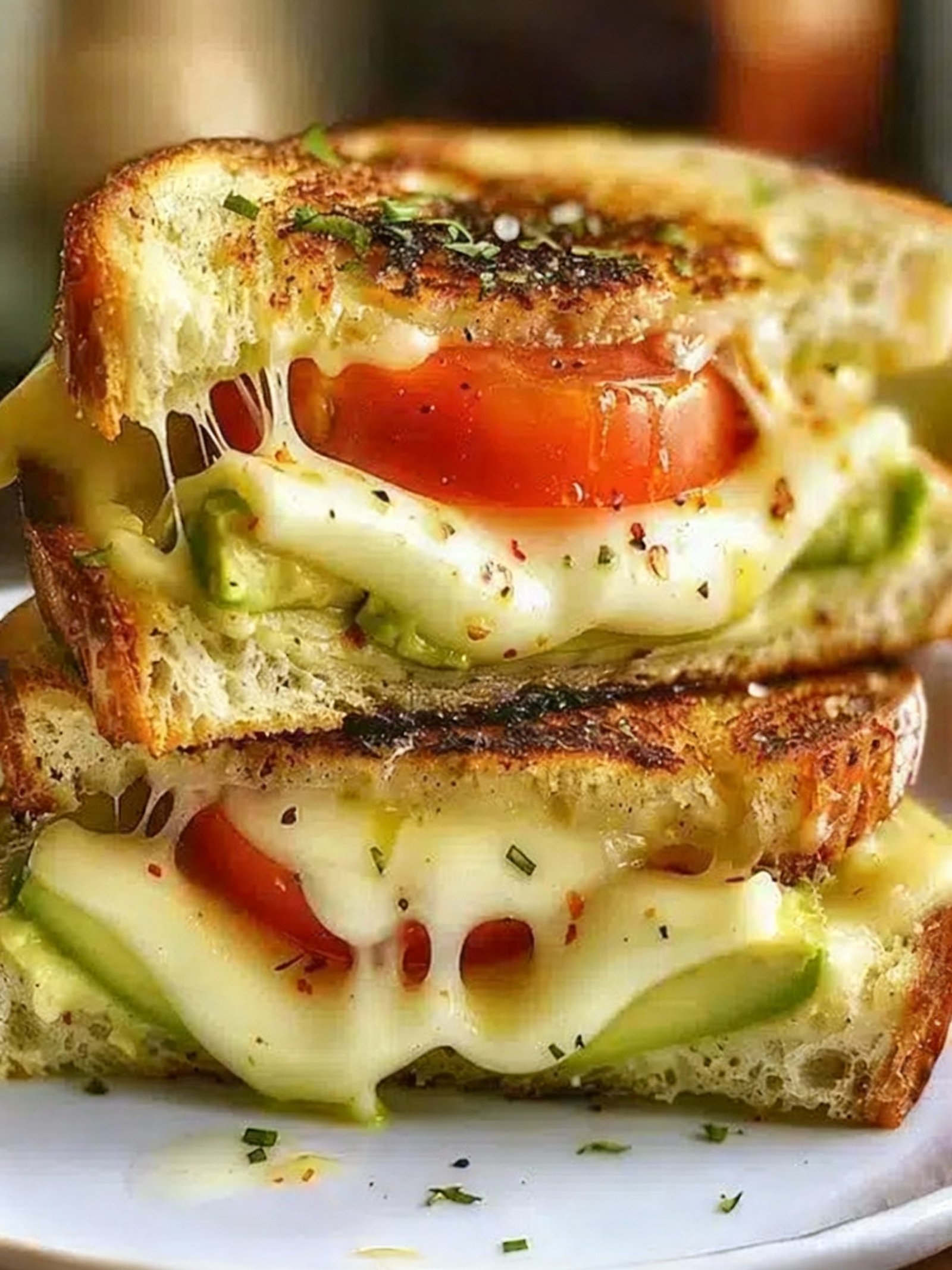 A warm, flavorful sandwich with creamy avocado, gooey mozzarella cheese, and juicy tomato, grilled to golden perfection in under 10 minutes.