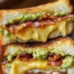 A buttery and toasty grilled cheese sandwich stuffed with creamy guacamole, crispy bacon, and melted cheese, offering a perfect blend of savory and fresh flavors.