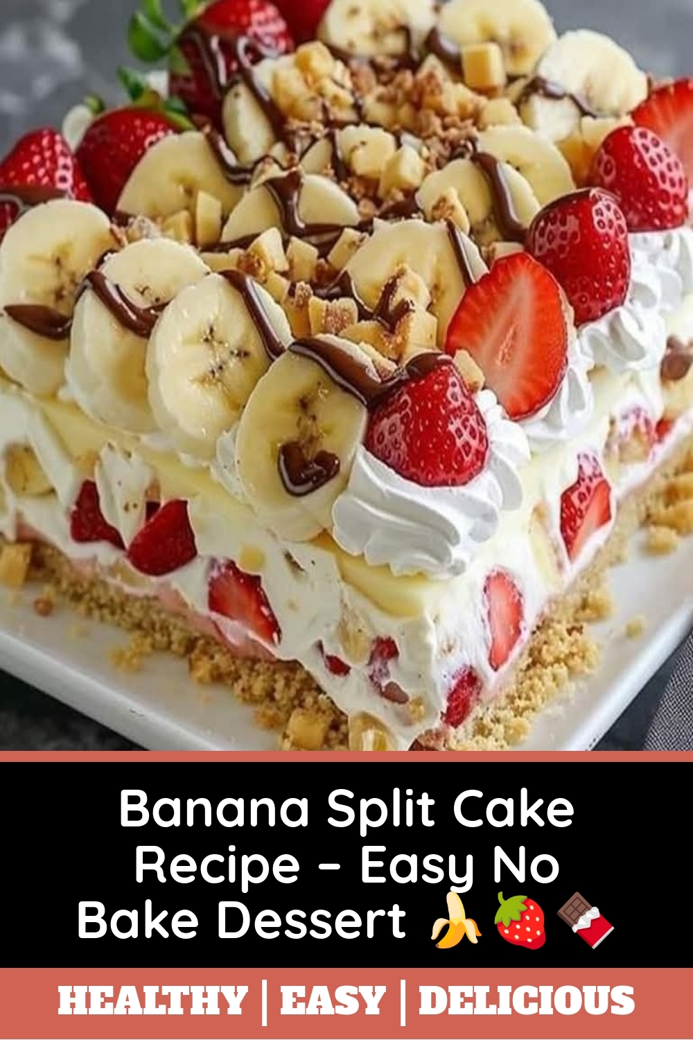 This Banana Split Cake Recipe – Easy No Bake Dessert is a magnificent layered dessert that perfectly mimics the iconic treat. It features a buttery graham cracker crust, a rich and creamy pineapple-cheese layer, fresh bananas, fluffy whipped topping, and a classic finish of strawberries, chocolate, and nuts. Its true significance lies in its brilliant no-bake design, so you can whip it up effortlessly even on the hottest summer days. This approachability makes it a fantastic choice for busy hosts, beginner bakers, or anyone needing a last-minute potluck hero. It aligns perfectly with our mission to deliver spectacular, stress-free recipes because it delivers maximum flavor with minimal effort. You can easily prepare it ahead of time, making it as convenient as our popular No Bake Cheesecake Bars. Furthermore, its crowd-pleasing nature makes it an ideal dessert for any gathering, much like our easy 3-Ingredient Fudge that everyone loves. This dessert is not just a recipe; it is a guaranteed triumph that brings joy to every single bite.