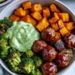 Barbecue Meatball Bowls with Avocado Goddess Sauce finished