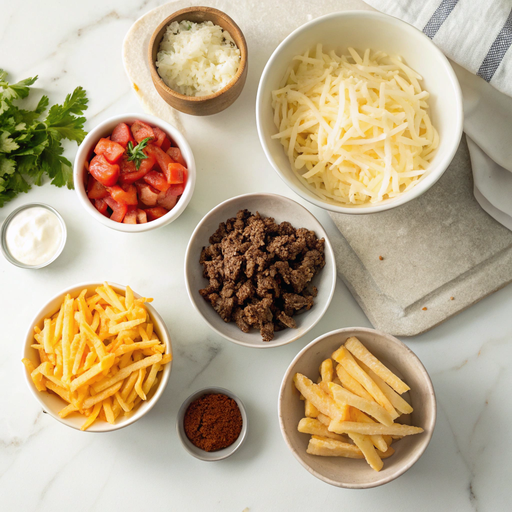 - Assemble each burrito by layering the seasoned beef, crispy fries, shredded cheese, sour cream, tomatoes, lettuce, and onions in the center of a tortilla.