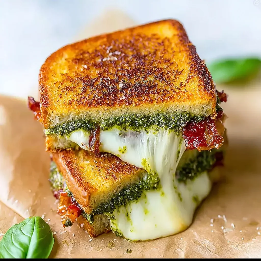 Transfer the finished pesto grilled cheese sandwiches to a cutting board and let them rest for 1-2 minutes. This brief rest allows the molten cheese to set slightly, making the sandwich easier to cut and eat without everything spilling out. Slice in half and serve immediately while hot and crispy.