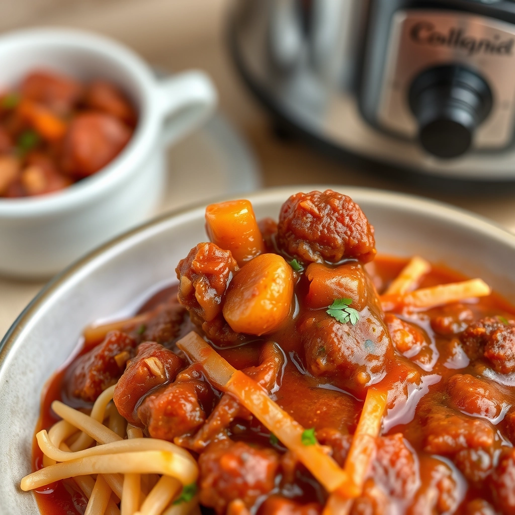 A hearty and comforting slow cooker goulash with tender beef, vegetables, and rich flavors.