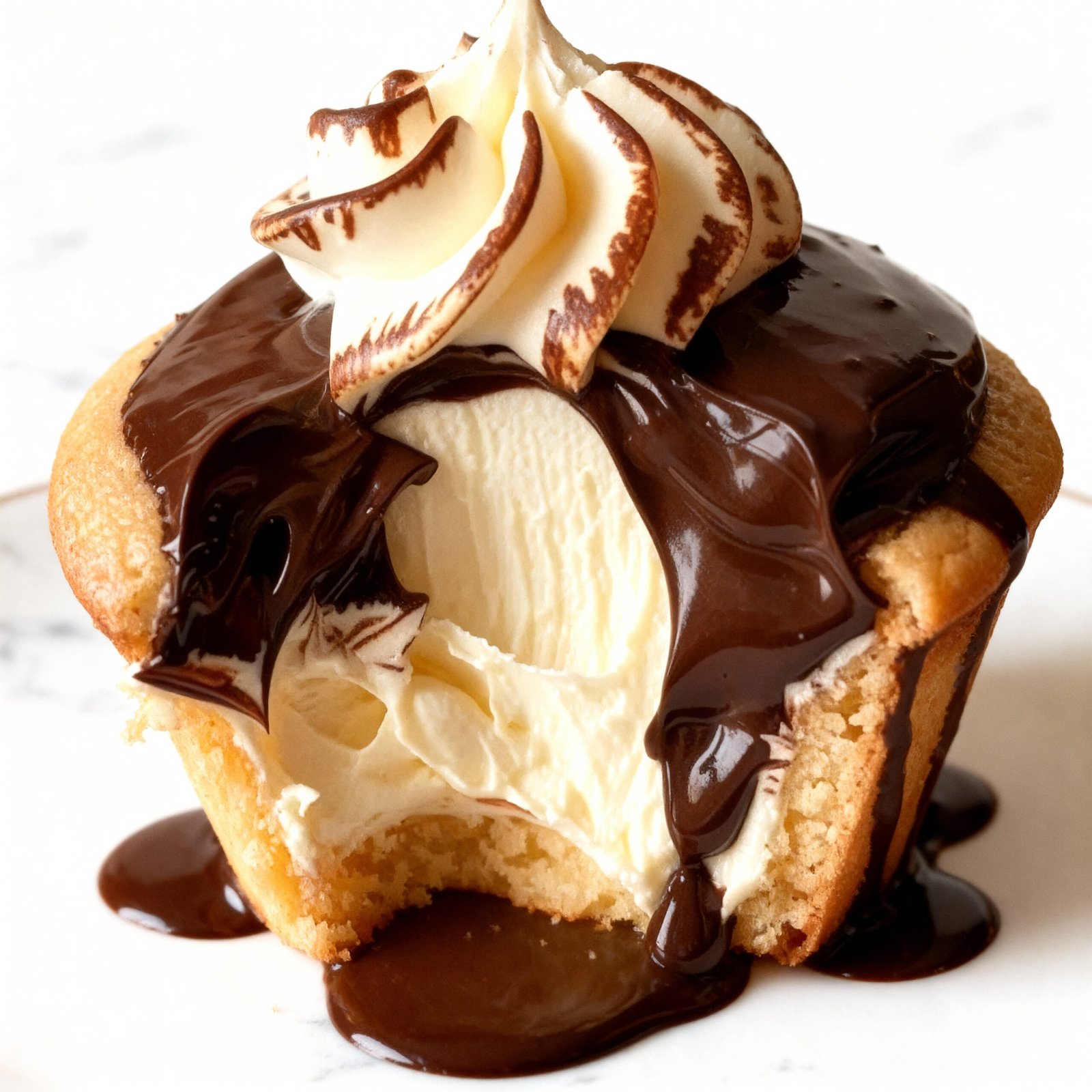 Tender vanilla cupcakes filled with rich, creamy pastry cream and topped with a glossy chocolate ganache.