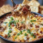 A rich and flavorful dip combining ground beef, smoky bacon, creamy cheeses, and a touch of bourbon BBQ sauce, perfect for parties and game days.
