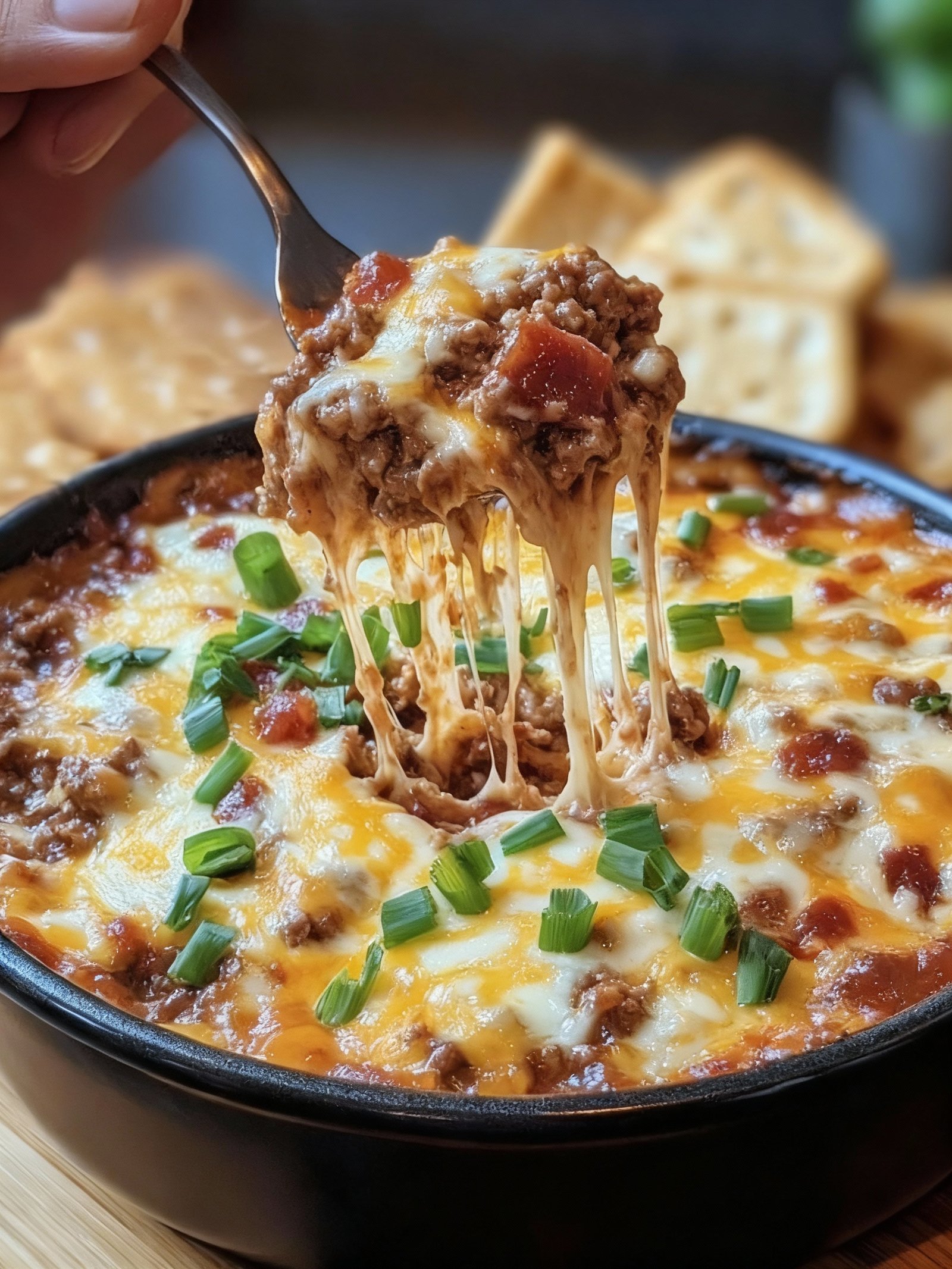 Remove the dip from the heat. Garnish with freshly chopped parsley or sliced green onions for a pop of color and freshness. Serve your Bourbon BBQ Bacon Cheeseburger Dip immediately with sturdy dippers like tortilla chips, toasted baguette slices, or celery sticks.