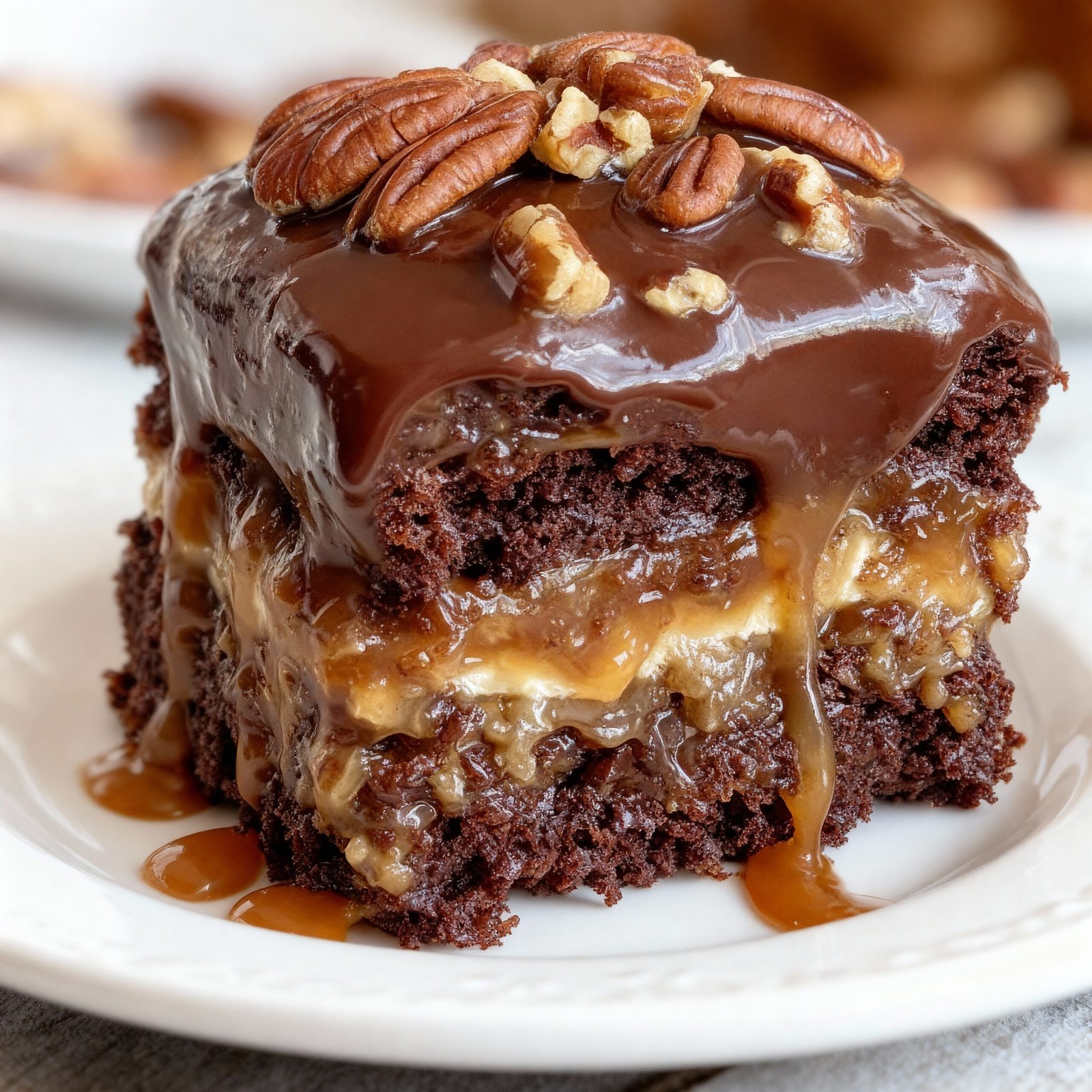 - Mistake: Adding all the toppings before baking the base cake. Fix: Bake the cake first, then add caramel, chocolate, and pecans afterward to prevent sinking and burning.