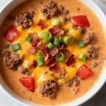 A rich, creamy, and hearty soup that tastes like a cheeseburger in a bowl, featuring ground beef, cheddar cheese, potatoes, and vegetables in a savory broth.