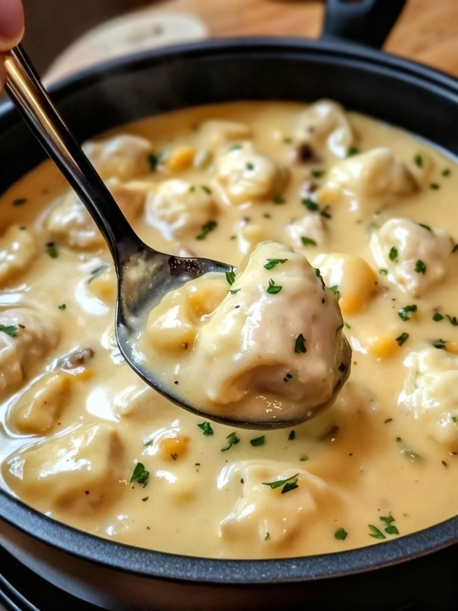 A classic Southern comfort food featuring tender chicken simmered in a creamy broth with soft, pillowy dumplings that soak up the flavorful gravy.