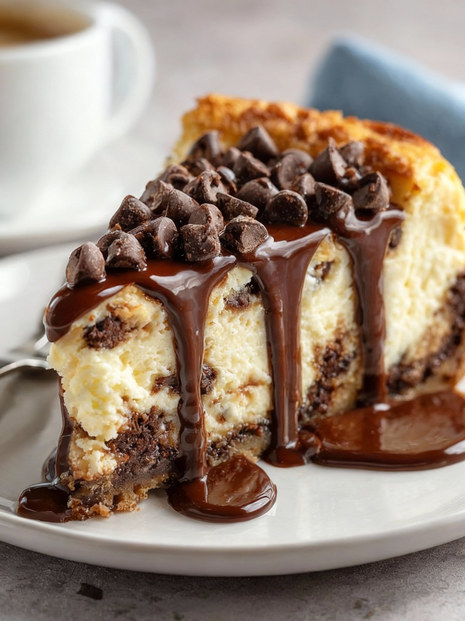 - Pair with a hot cup of coffee or a cold glass of milk to complement the creamy richness of the Chocolate Chip Cheesecake.