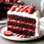 For the cleanest slices, use a sharp knife dipped in hot water and wiped dry between cuts. Allow the assembled chocolate strawberry cake to set for at least an hour before serving for the flavors to meld beautifully. Store any leftovers covered in the refrigerator.