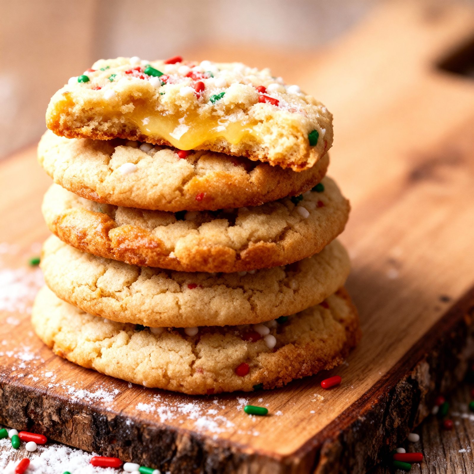 Soft, melt-in-your-mouth Christmas cookies made with cream cheese, butter, and cake mix, rolled in festive sprinkles and powdered sugar for a gooey, buttery treat perfect for the holiday season.