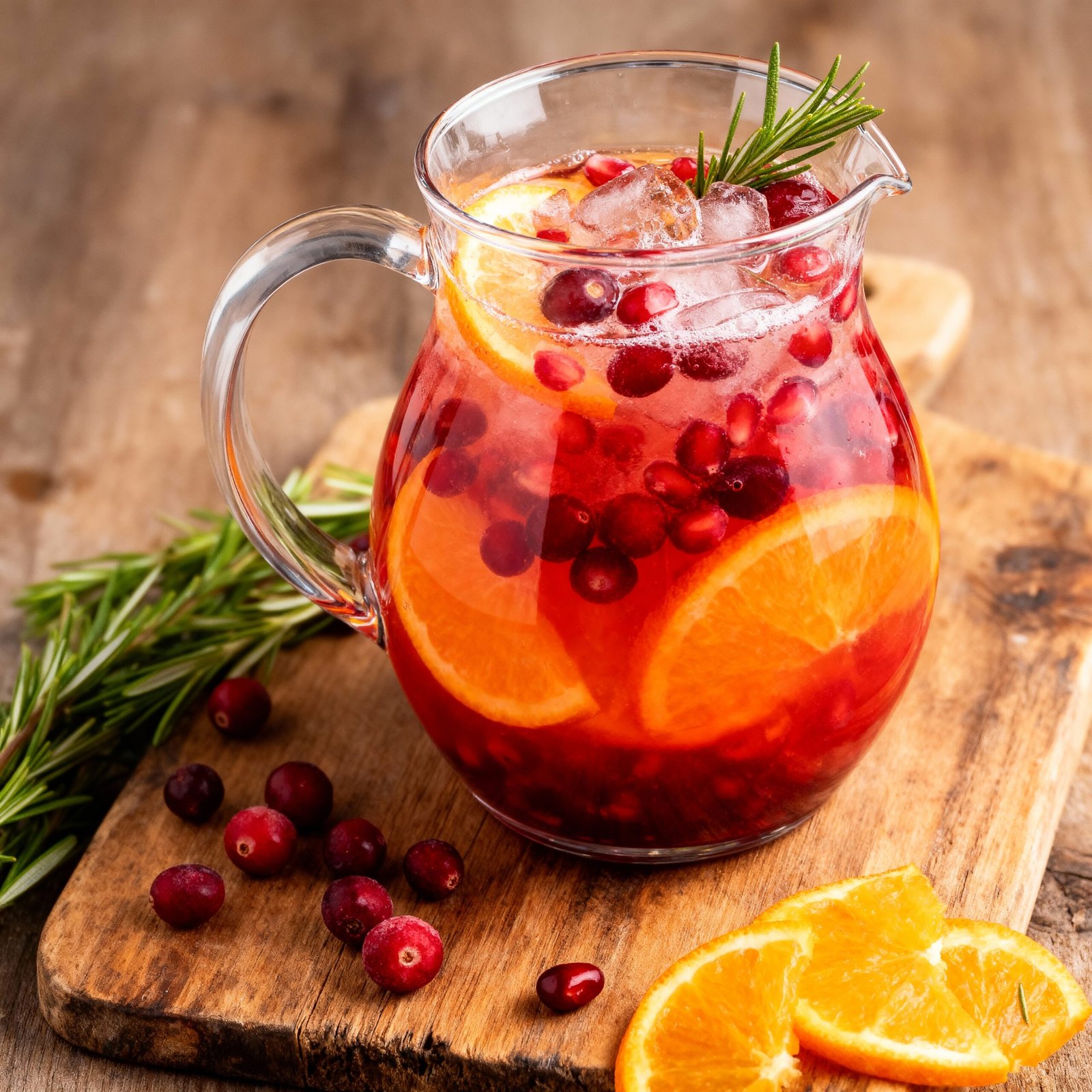6. Garnish with additional orange slices, cranberries, pomegranate seeds, and rosemary sprigs.