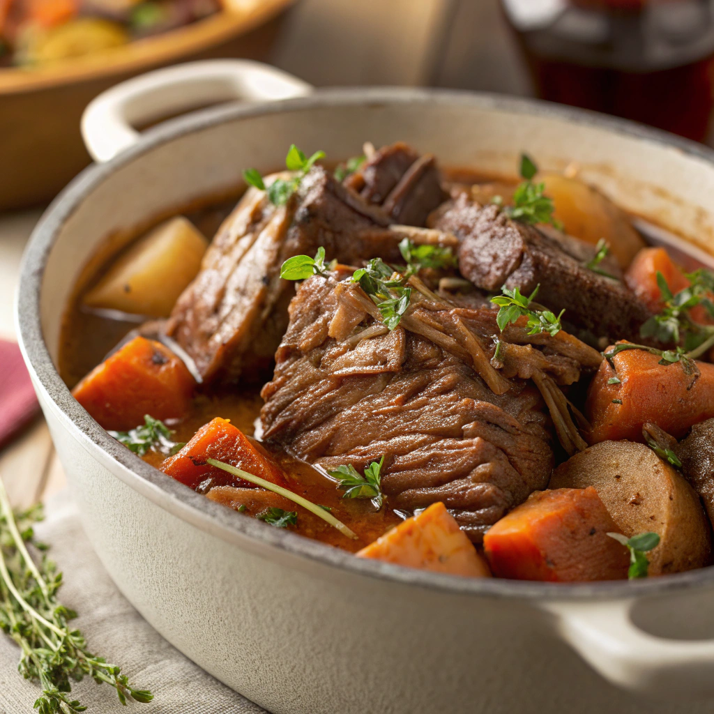 A tender and flavorful classic pot roast slow-cooked with vegetables and herbs, perfect for a comforting family meal.