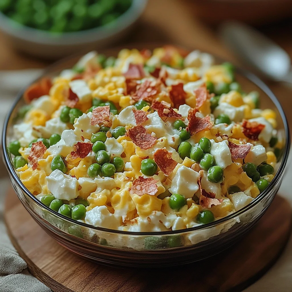 - Step 4: Combine Everything – In a large bowl, add peas, chopped eggs, bacon or ham, green onions, and cheese. Pour in dressing and gently fold to coat without mashing peas.