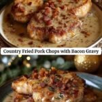 Crispy, country-fried pork chops dredged in seasoned flour and pan-fried, then smothered in a creamy bacon gravy made from bacon, pan drippings, flour, and chicken broth (or milk) for a classic Southern-style comfort dish.