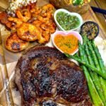This impressive Cowboy ribeye, scallops, shrimp, lobster, loaded potato, and asparagus with cowboy butter and chimichurri recipe is versatile enough for both elegant plating and hearty, family-style sharing, making any meal feel like a special event.