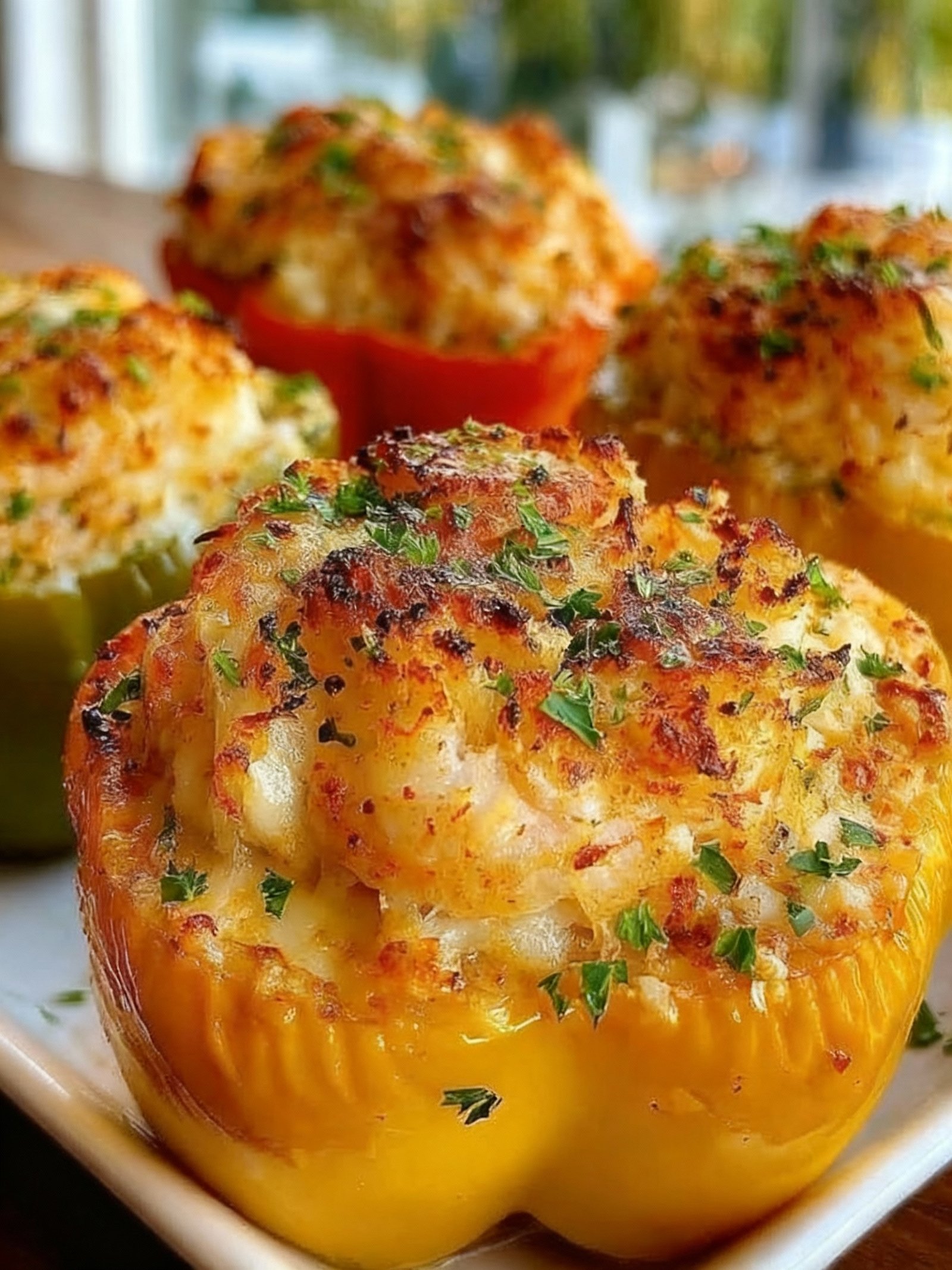 Delicious bell peppers stuffed with a savory mixture of crab, shrimp, vegetables, and seasonings, baked to perfection with a crispy topping.