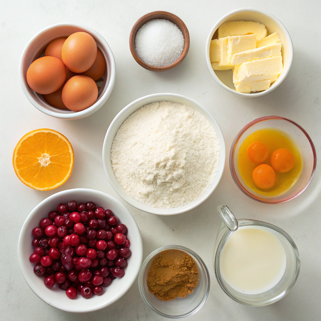 Gather all your ingredients for the Cranberry Orange Muffins: flour, sugar, baking powder, salt, eggs, milk, oil, fresh cranberries, and orange zest. Measure everything accurately for the best results. Tip: Zest the orange before juicing it to make the process easier.