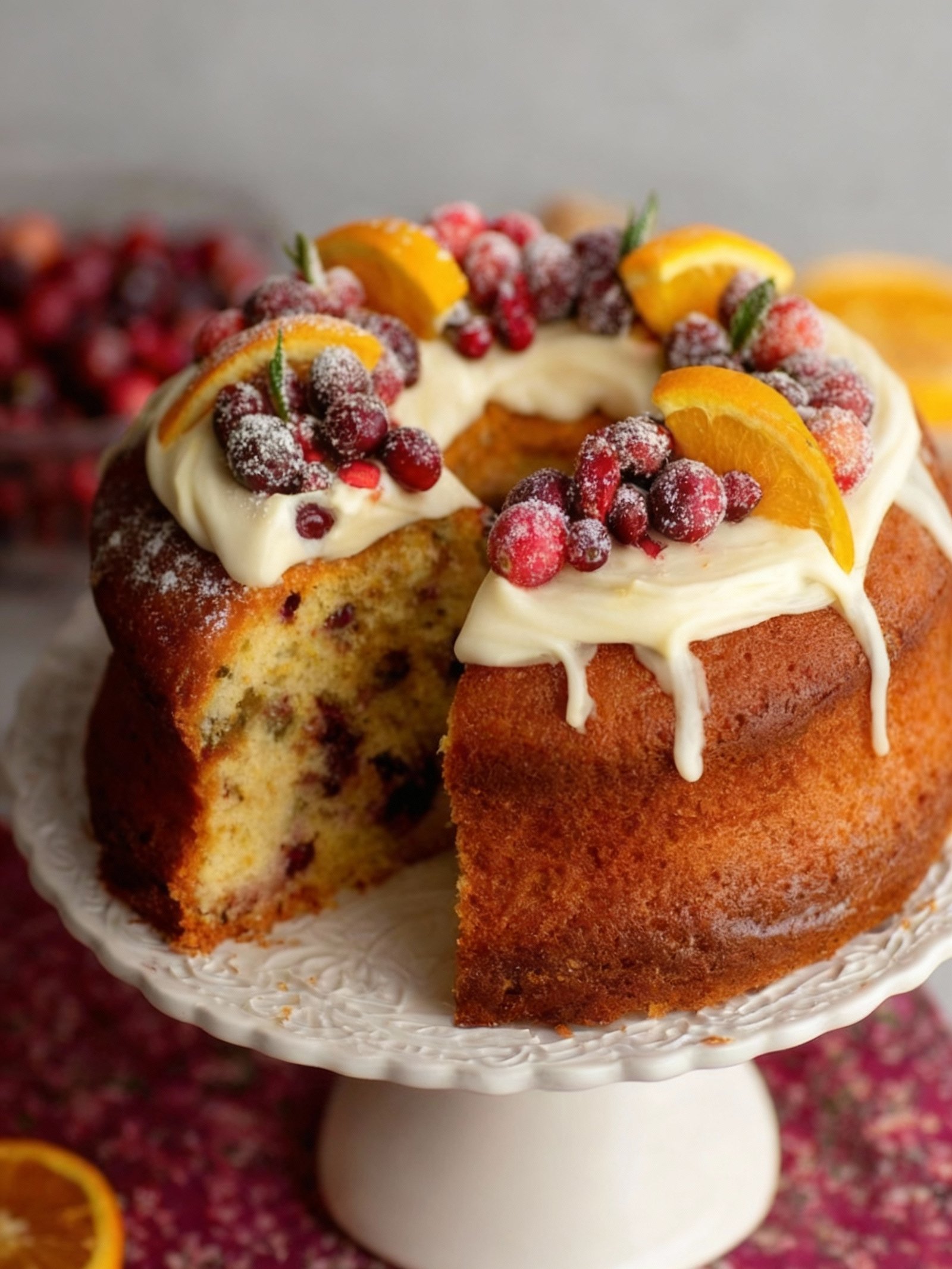 A moist and flavorful cake featuring fresh cranberries, orange zest, and warm spices, topped with a tangy citrus cream cheese frosting.