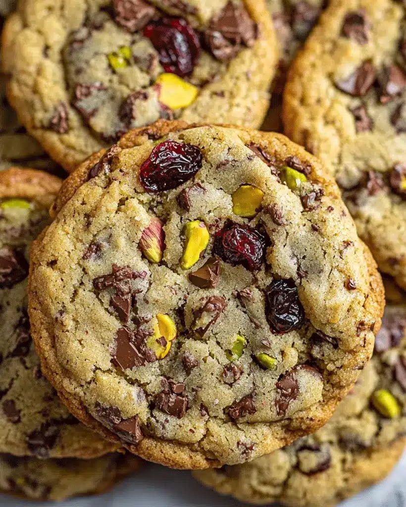 Cranberry Pistachio Dark Chocolate Cookies deliver a symphony of flavors and textures that make every bite irresistible. The rich, velvety dark chocolate melts on your tongue, while the tart cranberries burst with a bright, fruity contrast. Crunchy pistachios add a buttery, slightly salty depth, creating a perfect balance. The cookie itself is tender and chewy with crisp edges, so each mouthfeel is a delightful mix of soft and crunchy. Fragrant vanilla and warm brown sugar deepen the aroma, making your kitchen smell heavenly as they bake. Even though the dark chocolate dominates, the cranberries and pistachios shine through, so no single flavor overpowers the others. When you take a bite, the gooey chocolate pairs with the chewy dough, while the pistachios provide a satisfying crunch. Cranberry Pistachio Dark Chocolate Cookies are a masterclass in texture harmony, because they blend creamy, crisp, and chewy elements effortlessly.