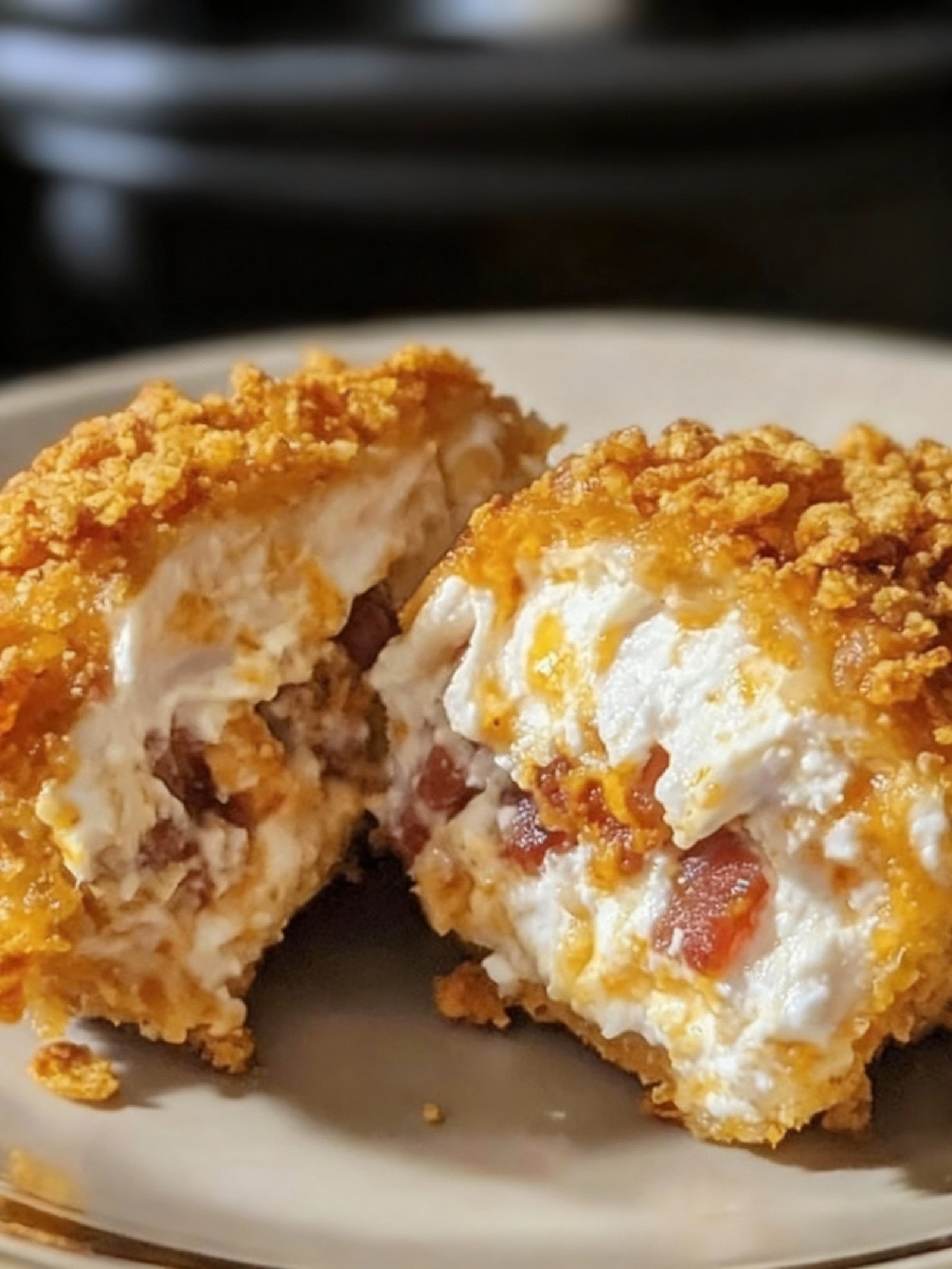 Tender chicken breasts stuffed with a creamy mixture of cream cheese, shredded cheddar, and crispy turkey bacon, coated in crushed Doritos for a crunchy, flavorful crust.