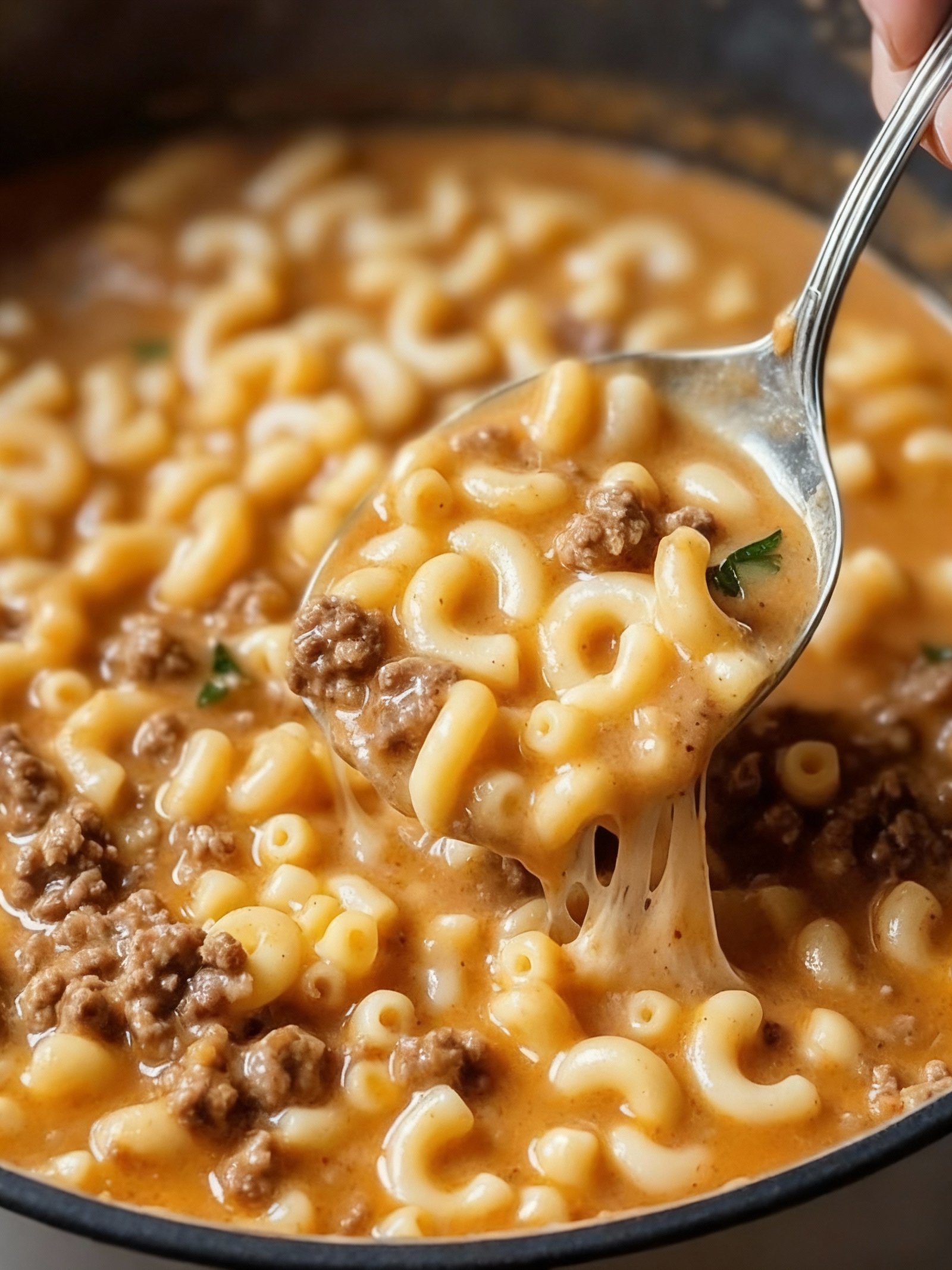 A hearty and comforting soup filled with beef, macaroni, and a creamy twist.