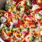 Creamy broccoli and cauliflower salad loaded with cheddar cheese, crispy bacon, sweetened dried cranberries, chopped walnuts, diced red onion, and carrots, all tossed in an easy homemade creamy dressing. Perfect crowd-pleasing side dish that’s simple to make and refreshing.