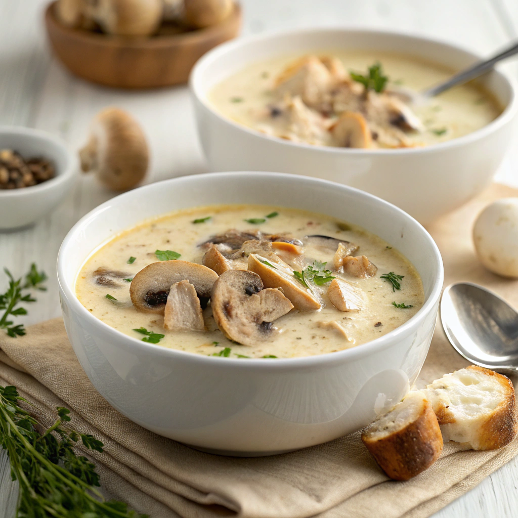 A rich and comforting soup featuring tender chicken, earthy mushrooms, and a creamy, savory broth. Perfect for chilly evenings.