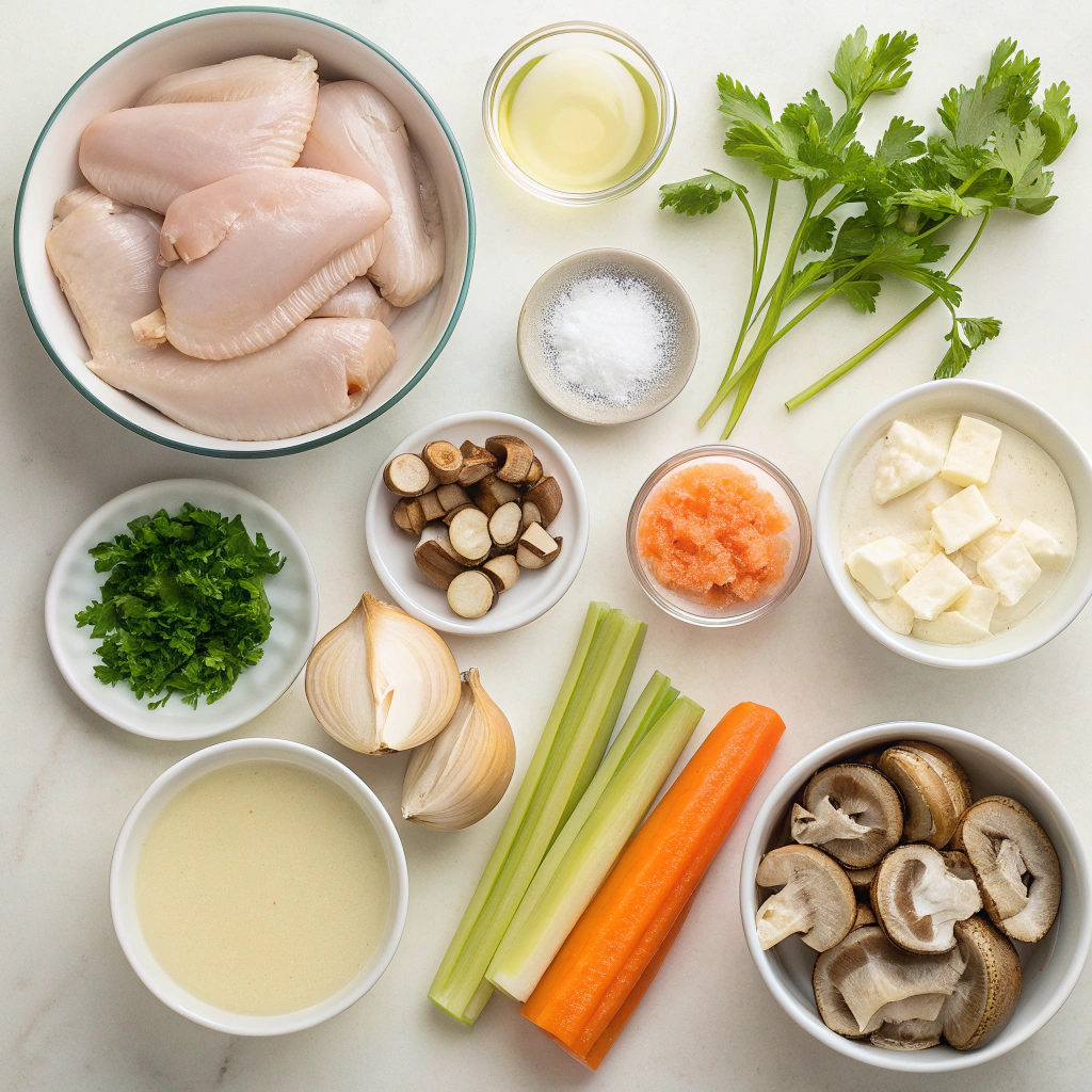 Gather 1 pound of boneless, skinless chicken breasts, 8 ounces of sliced cremini mushrooms, 1 diced onion, 2 minced garlic cloves, 4 cups of chicken broth, 1 cup of heavy cream, and 2 tablespoons of all-purpose flour. Chop the chicken into bite-sized pieces for even cooking.