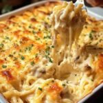 This Creamy Chicken Tetrazzini Casserole combines tender pasta, juicy chicken, and earthy mushrooms in a rich, cheesy sauce that bakes to golden perfection.