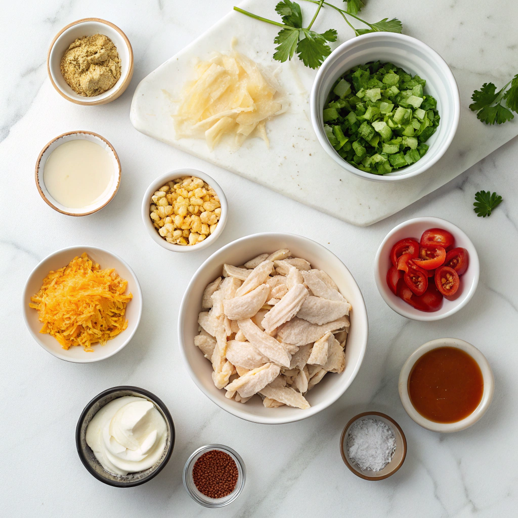 This Creamy Chicken Tortilla Soup typically includes shredded chicken, black beans, corn, and diced tomatoes in a rich, creamy broth. The creamy base often comes from ingredients like cream cheese, heavy cream, or blended beans, and it is always finished with classic toppings like crispy tortilla strips, avocado, and cilantro.
