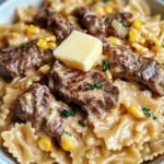 This Creamy Parmesan Steak & Sweet Corn Bowtie pasta delivers rich, savory flavors with tender steak and sweet corn in a velvety cheese sauce that clings perfectly to every bowtie.