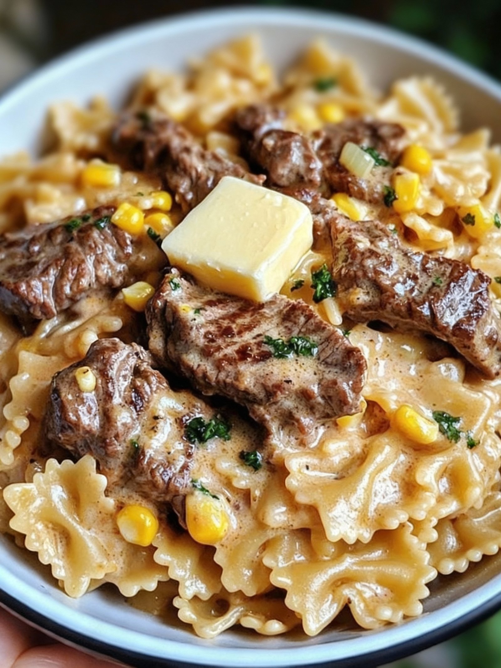 A rich and creamy pasta dish featuring tender steak, sweet corn, bowtie pasta, and a savory Parmesan sauce, perfect for a comforting and flavorful meal.