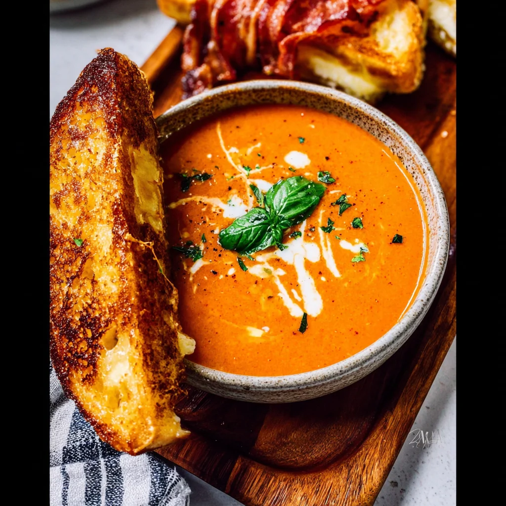 - Time to serve! Ladle the soup into your favorite bowls and garnish with a drizzle of olive oil and heavy cream, plus a sprinkle of fresh basil. Enjoy with Bacon Grilled Cheese Sandwich or Chicken Grilled Cheese Sandwich!