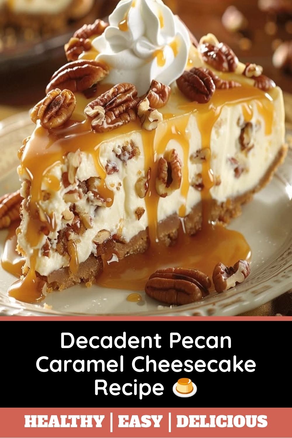 A rich and creamy cheesecake with a buttery pecan crust, swirled with homemade caramel and topped with toasted pecans.