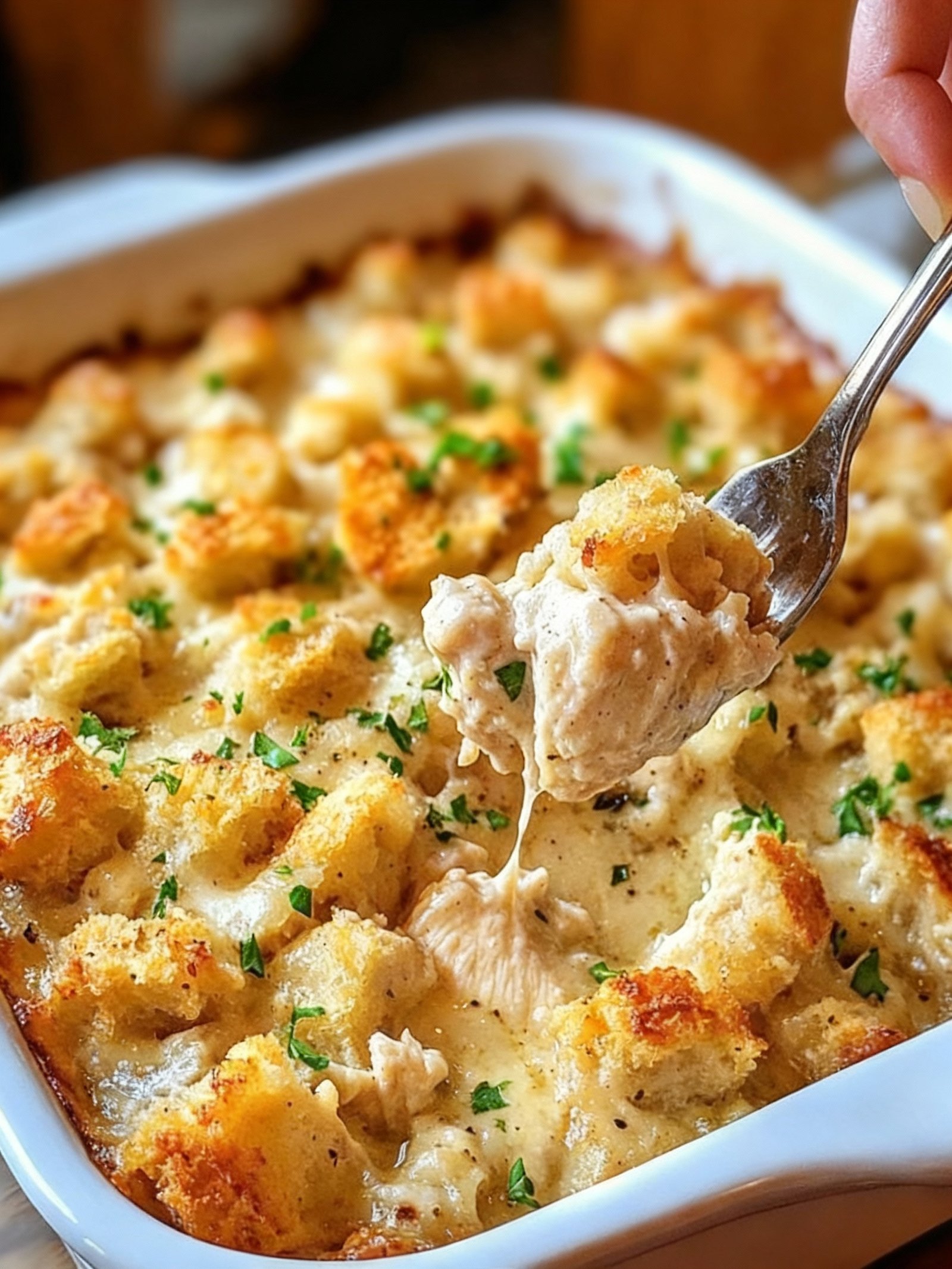 A creamy, savory chicken casserole combining shredded chicken, stuffing mix, cream of chicken soup, sour cream, and broth baked to golden perfection. This comforting dish is simple, hearty, and reminiscent of classic Southern home cooking.