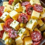 This vibrant appetizer combines creamy, marinated cheese cubes with savory salami and tangy pickles for a burst of flavor in every bite.