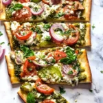 The magic of this flatbread pizza lies in the quality and freshness of its components. Using a good olive oil and vibrant, crisp vegetables makes all the difference in achieving that authentic Mediterranean flavor profile.