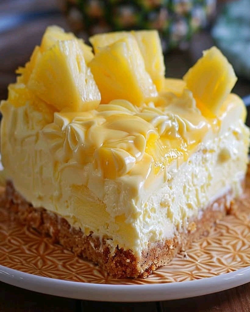 A creamy and tropical no-bake cheesecake with a delightful pineapple topping.