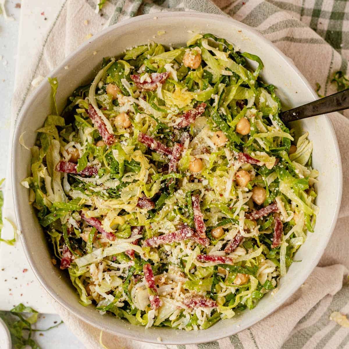 - To a large bowl, add the shredded lettuce, chickpeas, Italian salami, and mozzarella cheese. Pour the prepared dressing on top and toss to coat.