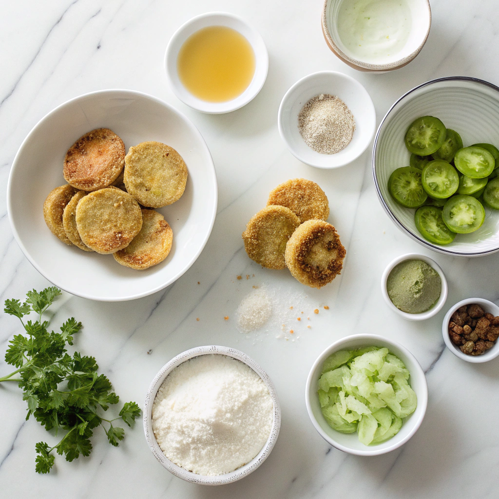 First, gather all your ingredients for the Fried Green Tomatoes Recipe so everything stays within easy reach. Slice the green tomatoes into ¼-inch thick rounds, then lightly salt them and let them sit for 10 minutes to draw out excess moisture—this helps the coating stick better. Meanwhile, whisk together the flour, cornmeal, and spices in one bowl, and beat the eggs with a splash of buttermilk in another. Pat the tomato slices dry with a paper towel to ensure a crispier finish. Next, dip each slice into the egg mixture, let the excess drip off, then coat it evenly in the flour mixture. Heat about ½ inch of oil in a skillet over medium-high heat until it shimmers. Carefully add the tomatoes in a single layer, frying them for 2–3 minutes per side until golden brown. Transfer them to a wire rack or paper towel-lined plate to drain. For a time-saving tip, fry in batches and keep finished slices warm in a low oven. Serve immediately with a zesty remoulade or buttermilk ranch for dipping.