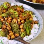 Toss everything vigorously for 1-2 minutes until the garlic ginger sauce evenly coats every floret and chickpea. The sauce should be glossy and cling to the ingredients. Remove from heat.