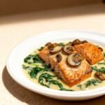 Cook the salmon skin-side down first over medium heat until the skin is crispy. Then flip and cook just until the internal temperature reaches 145°F. Remove it from the pan promptly to avoid carryover cooking, ensuring your Garlic Butter Salmon with Spinach and Mushrooms in Creamy Sauce stays moist and flaky.