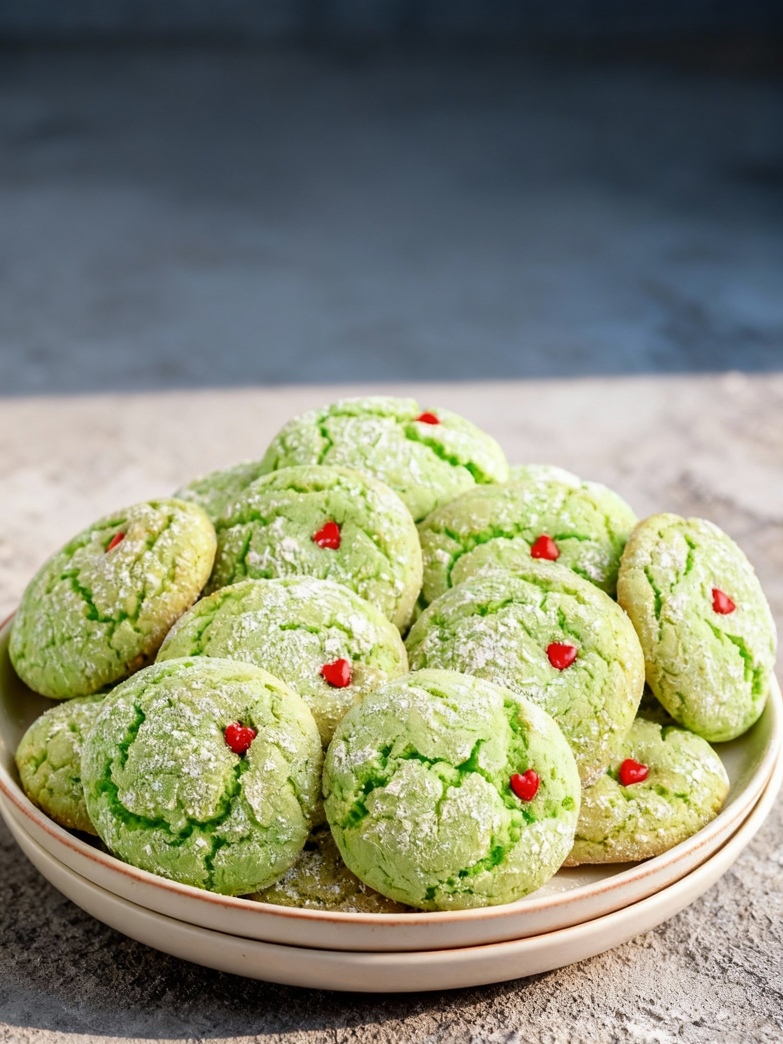Soft and chewy green sugar cookies inspired by the Grinch, decorated with heart sprinkles for a festive holiday treat.