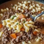 A hearty and comforting soup combining ground beef, vegetables, and egg noodles in a flavorful broth, perfect for a satisfying meal.