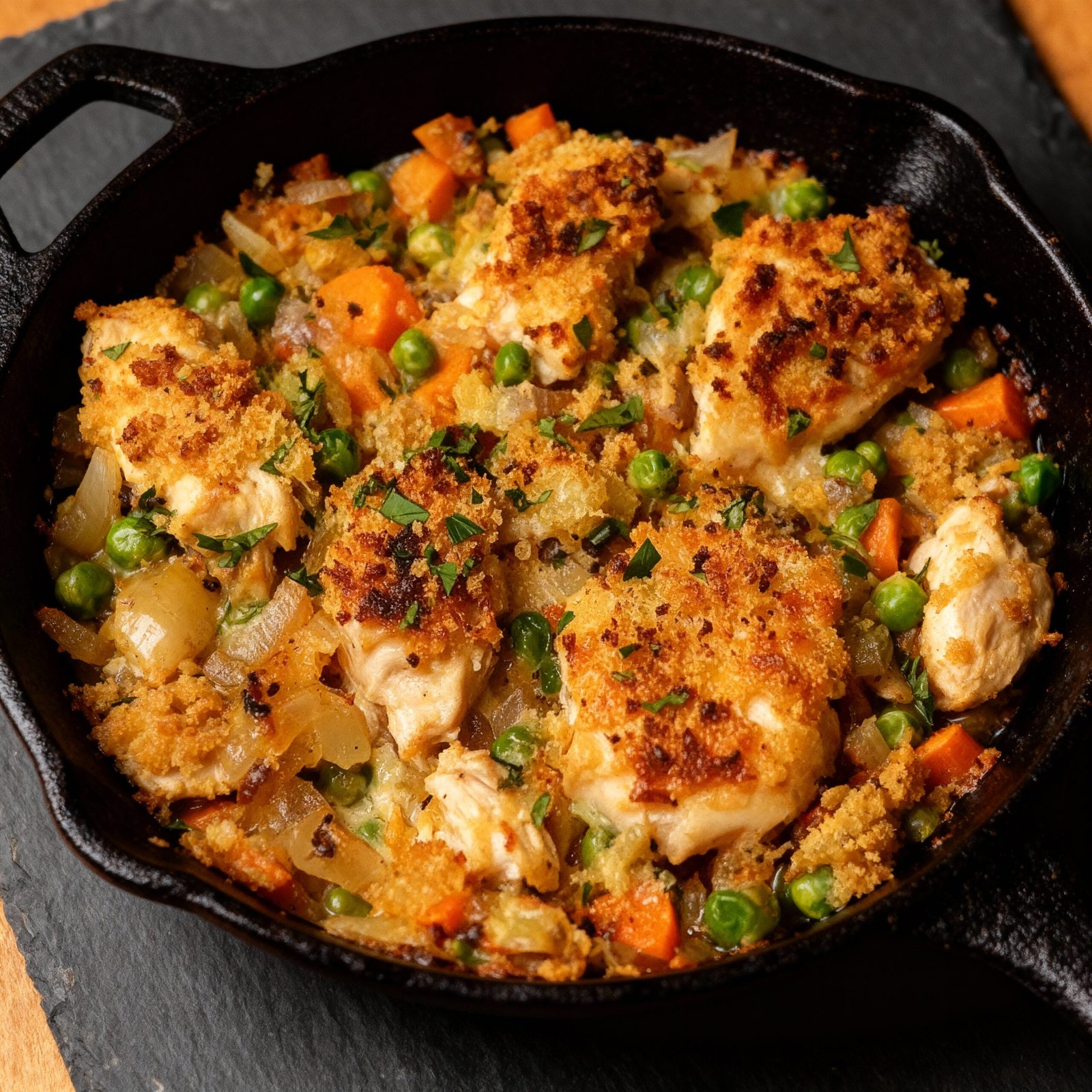 A comforting and hearty casserole that combines tender chicken with a creamy sauce, vegetables, and a golden breadcrumb topping.