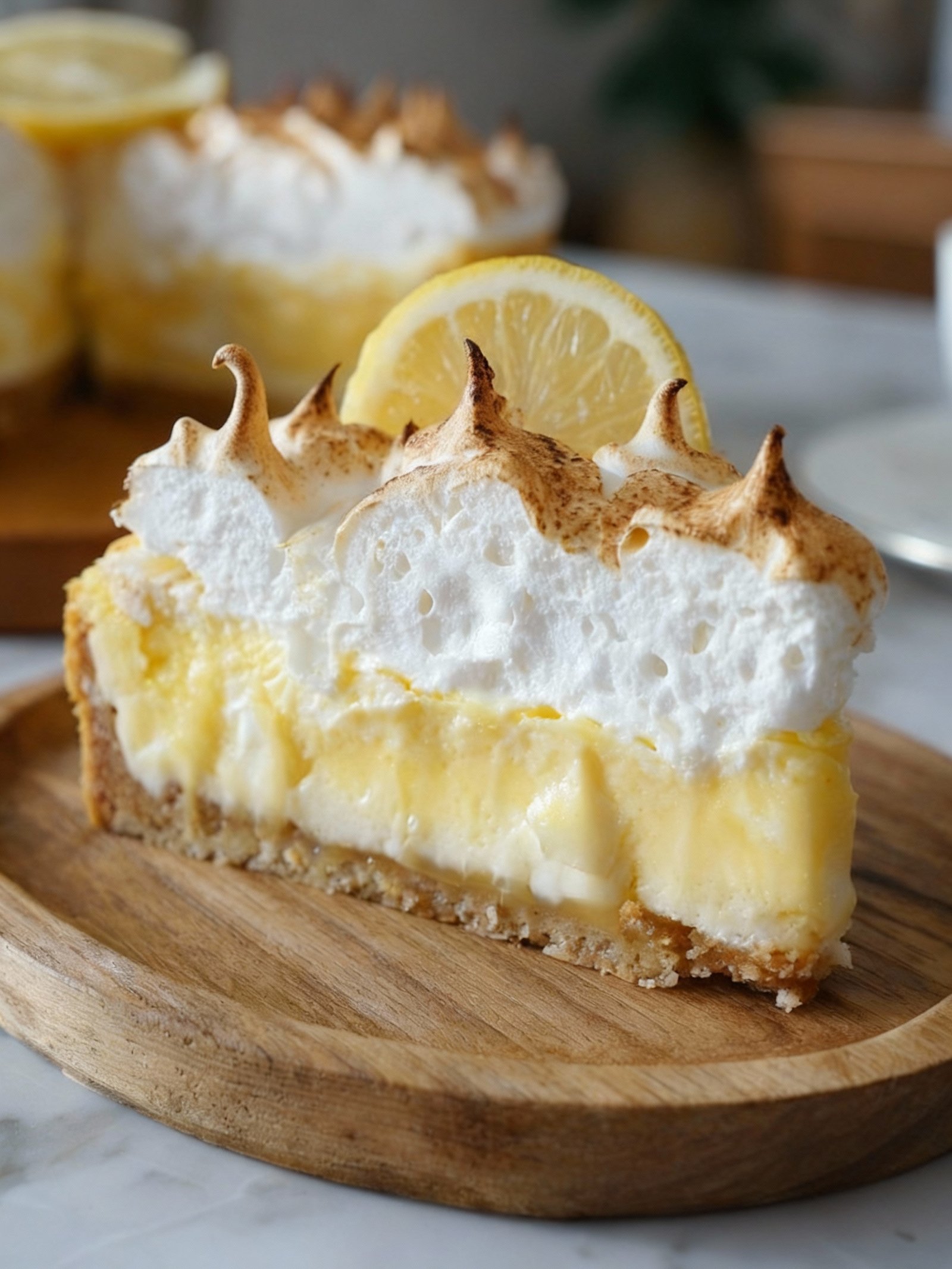 A rich and creamy lemon meringue cheesecake featuring a buttery graham cracker crust, tart lemon curd, and a toasted meringue topping.
