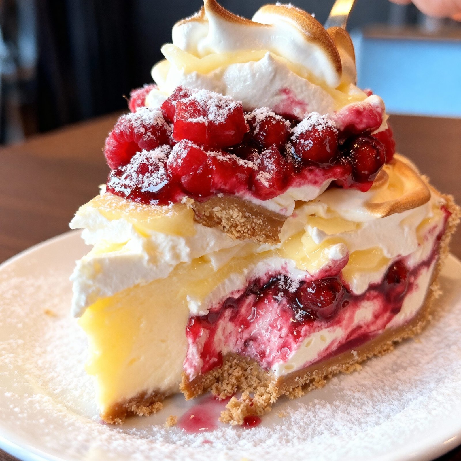 A luscious cheesecake featuring a creamy lemon custard layer, fresh raspberries, and a fluffy meringue topping, combining tartness and sweetness in a stunning dessert.