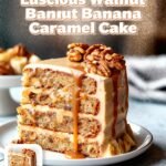 A moist banana cake layered with luscious caramel and crunchy walnuts, topped with cream cheese frosting for a rich and flavorful dessert.